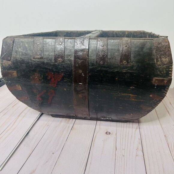 | Characteristics of goods | Antique Chinese Rice Grain Harvest Basket Bucket Scoop MeasureOne side metal stripping is lifted up due to a missing nail-easily repairablePlease see pics for wear-antique so not perfect | ||