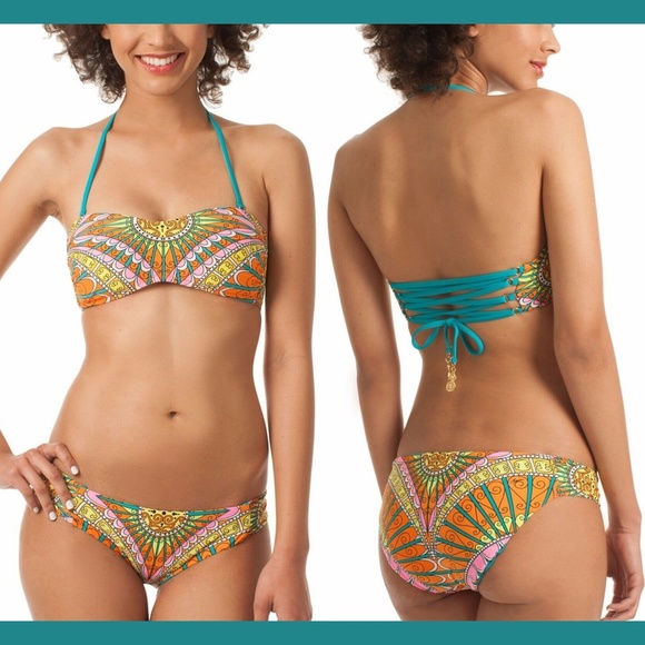 | Characteristics of goods | Bursting with color in cool boho prints, these hipster-rise bikini bottoms flatter with shirred tab sides and a full-coverage back.Ties behind back. NEW 2PC Trina Turk 'Capri' Bandeau Bikini Top + Shirred Bottoms [SZ 6] #B53Bursting with color in cool boho prints, this bandeau bikini top flatters with supportive molded cups and a strappy lace-up back for a customized fit.Removable strap.shirred sidesFully lined. | ||