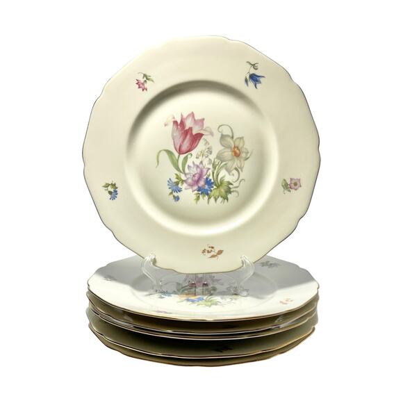 | Characteristics of goods | Length 9 5/8”Height 1”Circa 1950-70s Hutschenreuther & Royal York “Bridal Bouquet (Madeleine)” 6 Dinner Plates 9 5/8”Good vintage condition. However, two plates have small interior wear in center. No chips, cracks, or fleabites. Comes with age and use, see pictures. | ||